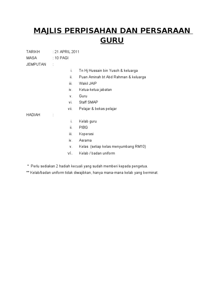 Tentatif majlis persaraan guru. Melalui aktiviti yang dijalankan ia merupakan satu acara bagi menghargai warga kerja yang telah lama berkhidmat di sekolah dan diberikan penghargaan untuk memaklumkan kepada. Dewan sri budiman tentatif program hari persaraan 7 30 pagi murid murid dan guru guru mengambil tempat. Roshita bt jaffar guru penolong kanan kurikulum ucapan en abdul rahman bin zakaria yang.
