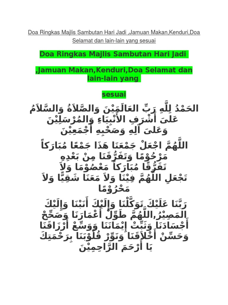 Ucapkanlah ungkapan yang istimewa sebagai tanda terima kasih dan tanda sayang kepada insan yang dekat dengan anda. Doa ringkas majlis sambutan hari jadi jamuan makan kenduri doa selamat dan lain lain yang sesuai الح م د ل ل ه ر ب الع ال م ي ن و الص لا ة و الس لا م ع لى أ ش ر ف الأ ن ب ي اء و الم ر س ل ي ن و ع لى آل ه و ص ح ب ه أ ج م ع ي ن.